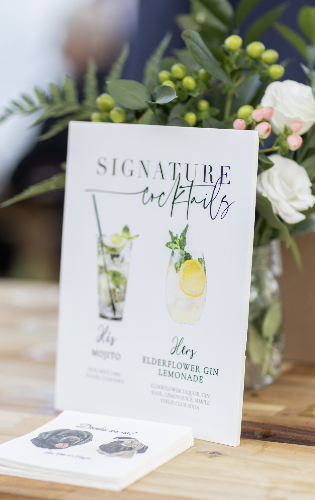 “Cocktail hour featured a caricature artist drawing caricatures of our guests, a 360-degree video booth, a giant wedding crossword puzzle, signature drinks (a mojito for him and an elderflower gin cocktail for me), passed appetizers, an oyster and shrimp bar, and signing of our guest book, which was a handmade cornhole set constructed by Alex’s dad. We also had special cocktail napkins with cartoon images of the family dogs on them saying, “Drinks on us!” Our guests certainly got a kick out of that!”