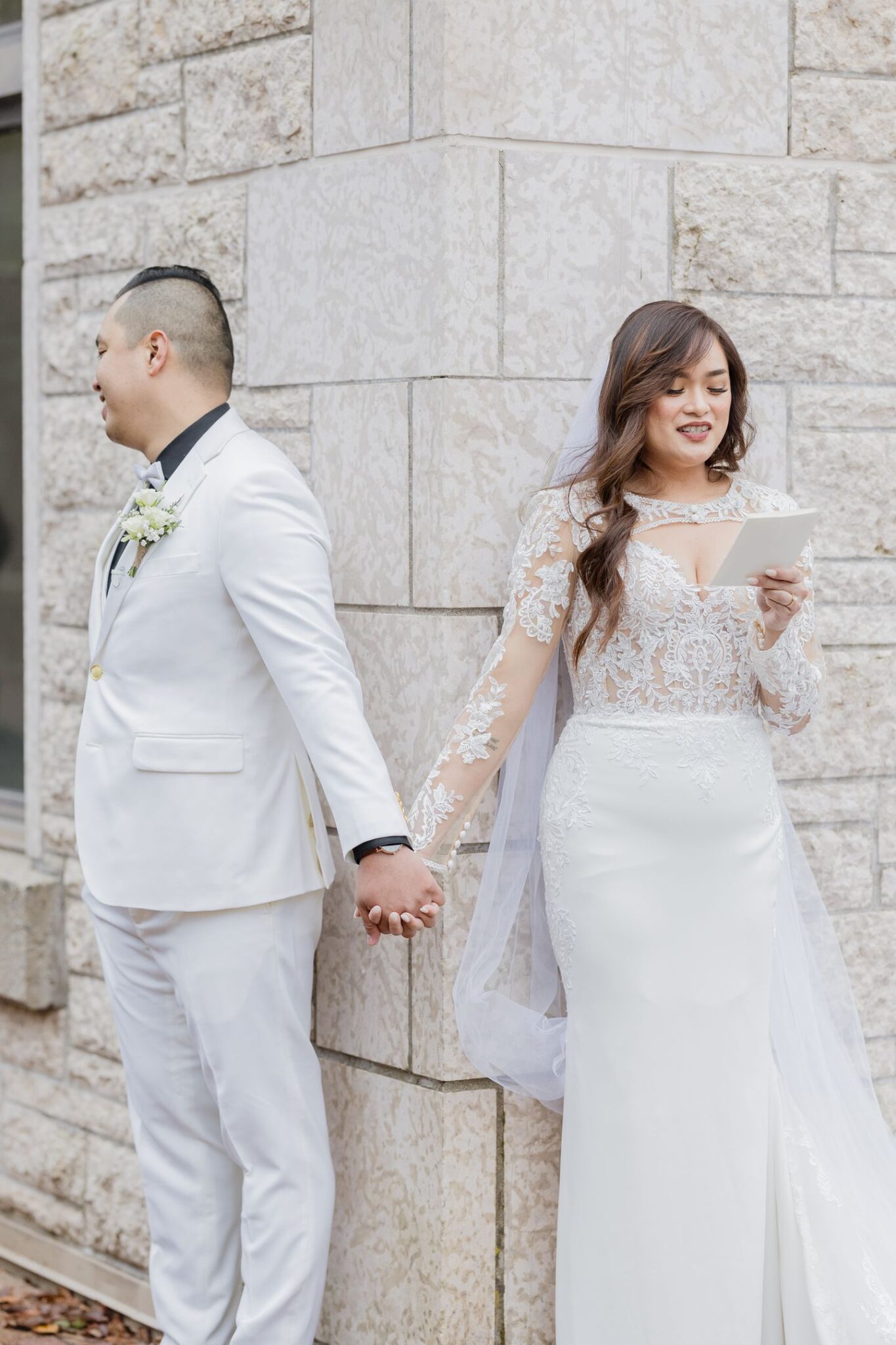 Before the ceremony, Miles and Neil wanted the chance to exchange private vows but they didn’t want to spoil the moment of him seeing her for the first time walking down the aisle. So they opted for a “first touch,” a beautiful gesture that allowed them to share heartfelt words without actually seeing each other. Chuunice Photography captured this tender moment with a snapshot of their unwavering love.