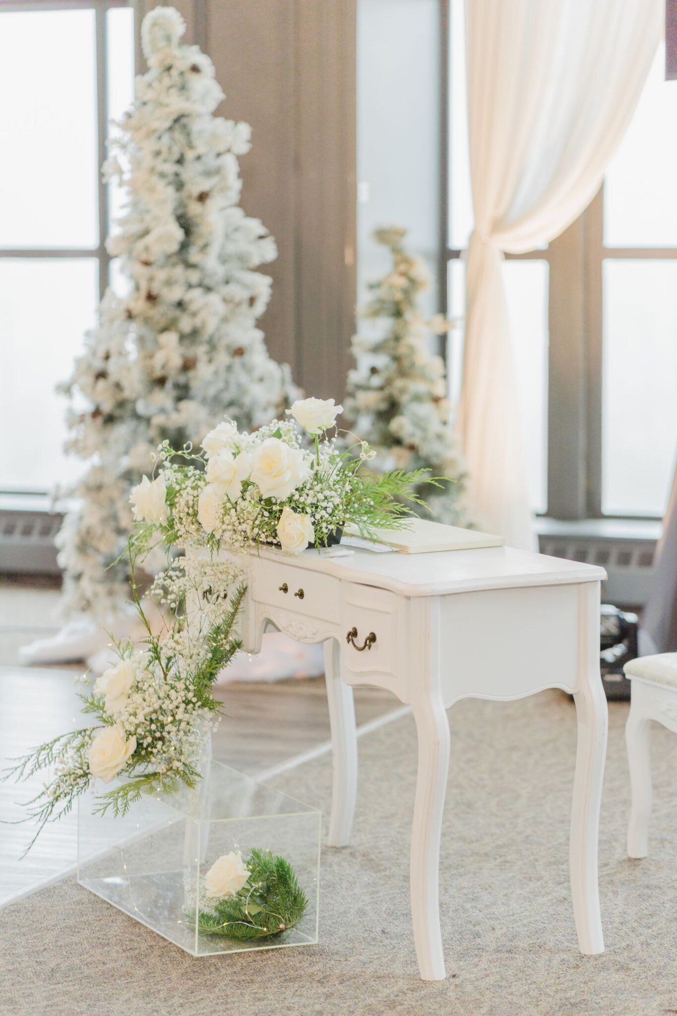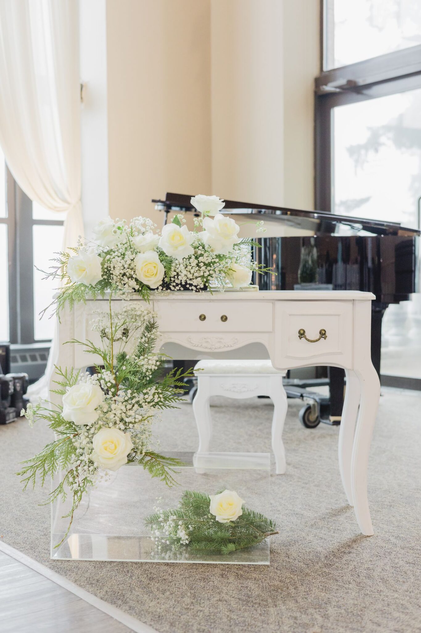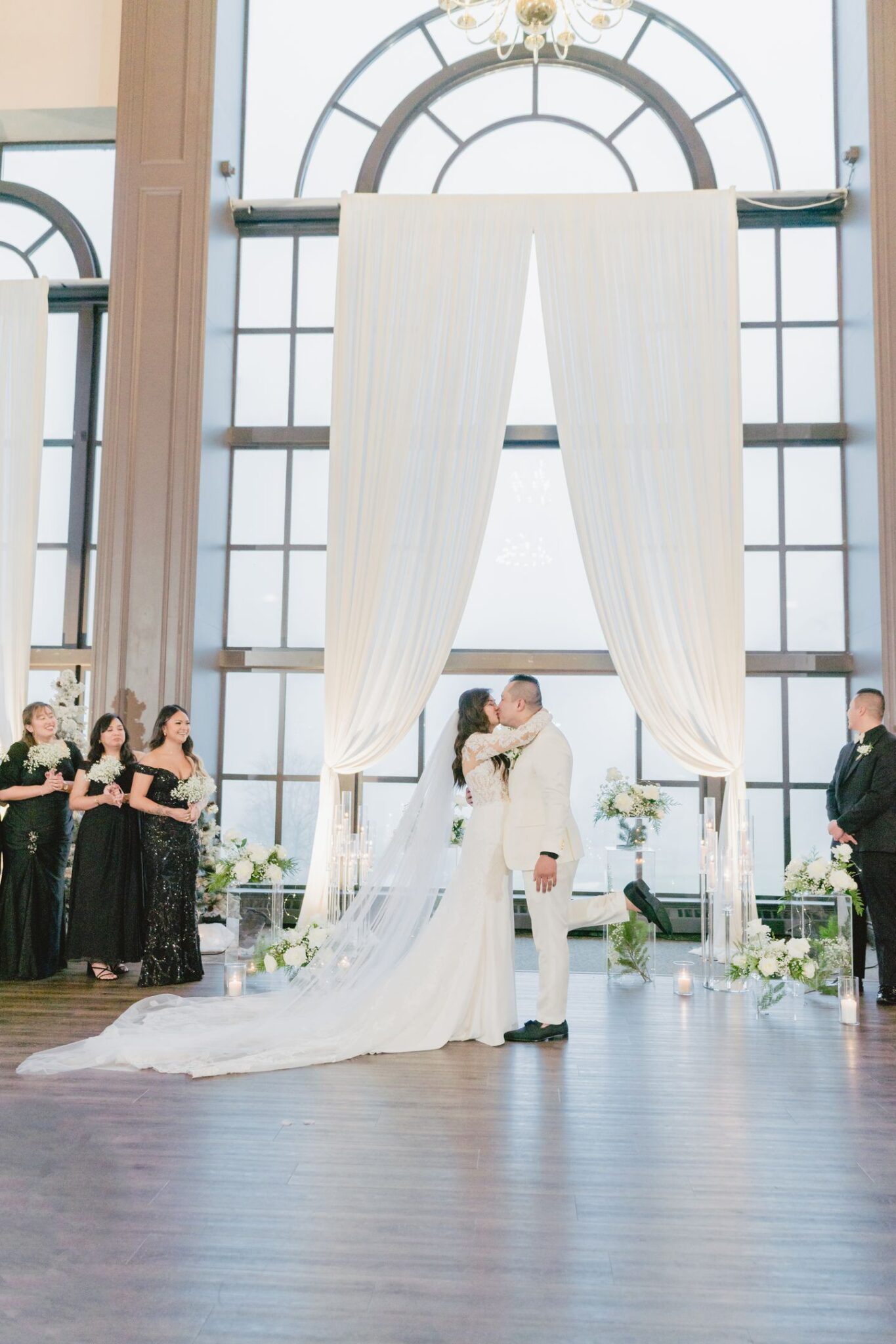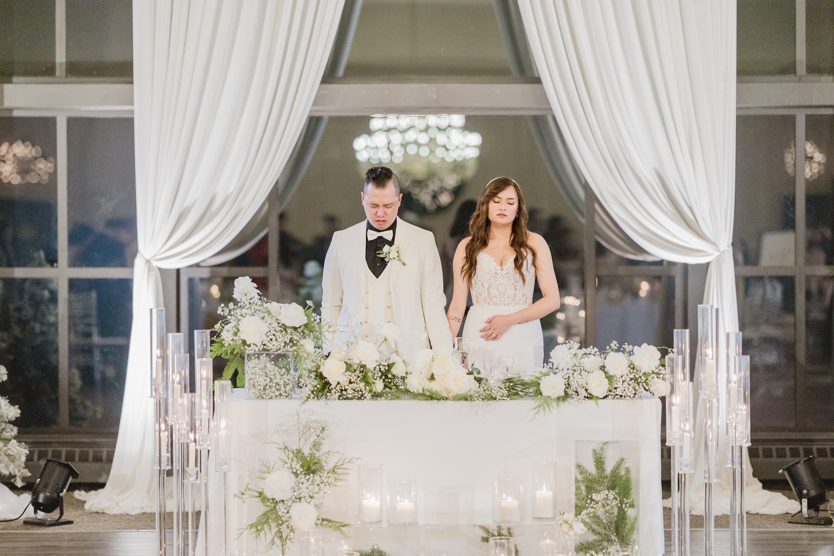 The ceremony was both modern and elegant, with acetate chairs, white roses and whimsical Baby’s Breath creating a breathtaking backdrop. The bridal party, dressed in timeless black attire, provided a sophisticated contrast to the white decor. The couple’s talented friends played live music as guests arrived.