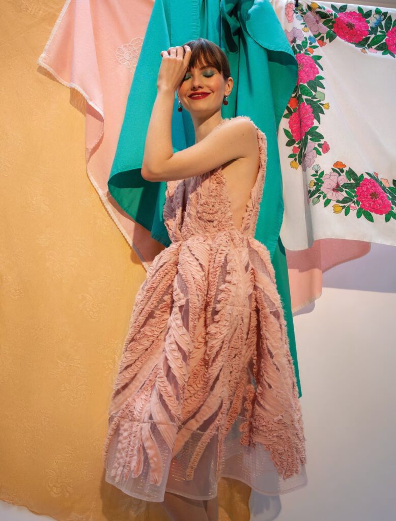 Dress, Jaclyn Whyte; earrings, Blair Nadeau; ring, Anne Sportun; gingham tablecloth and yellow velvet pillow, Baa Baazaar.