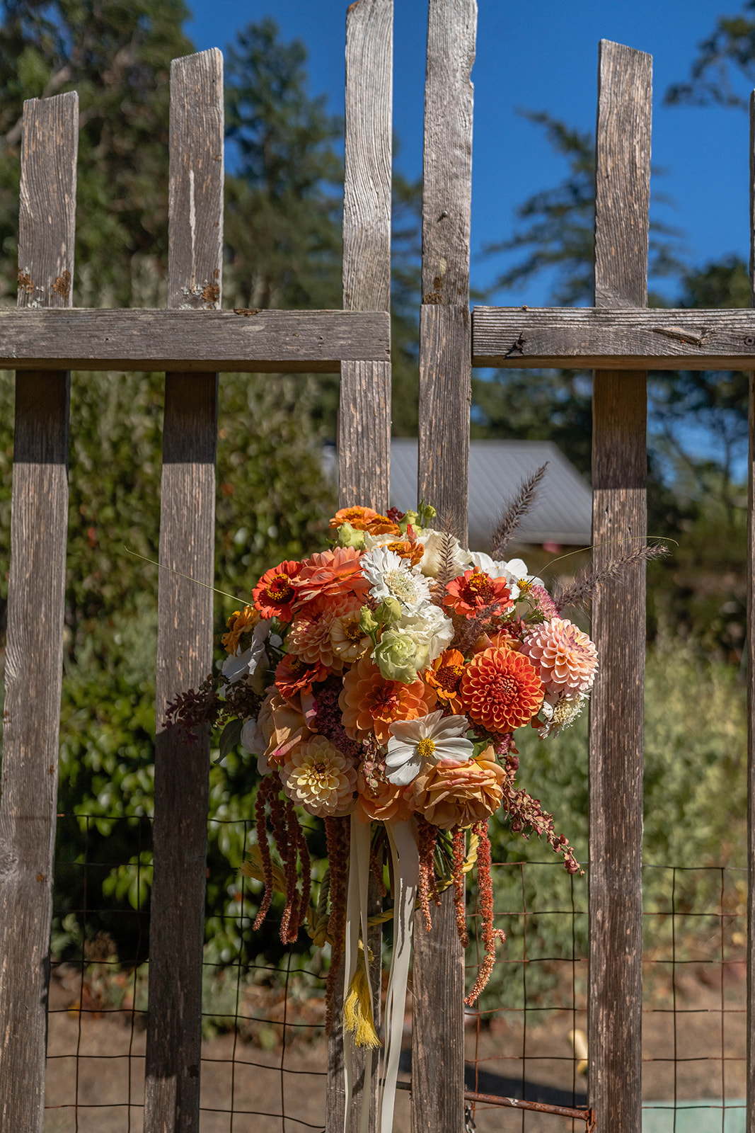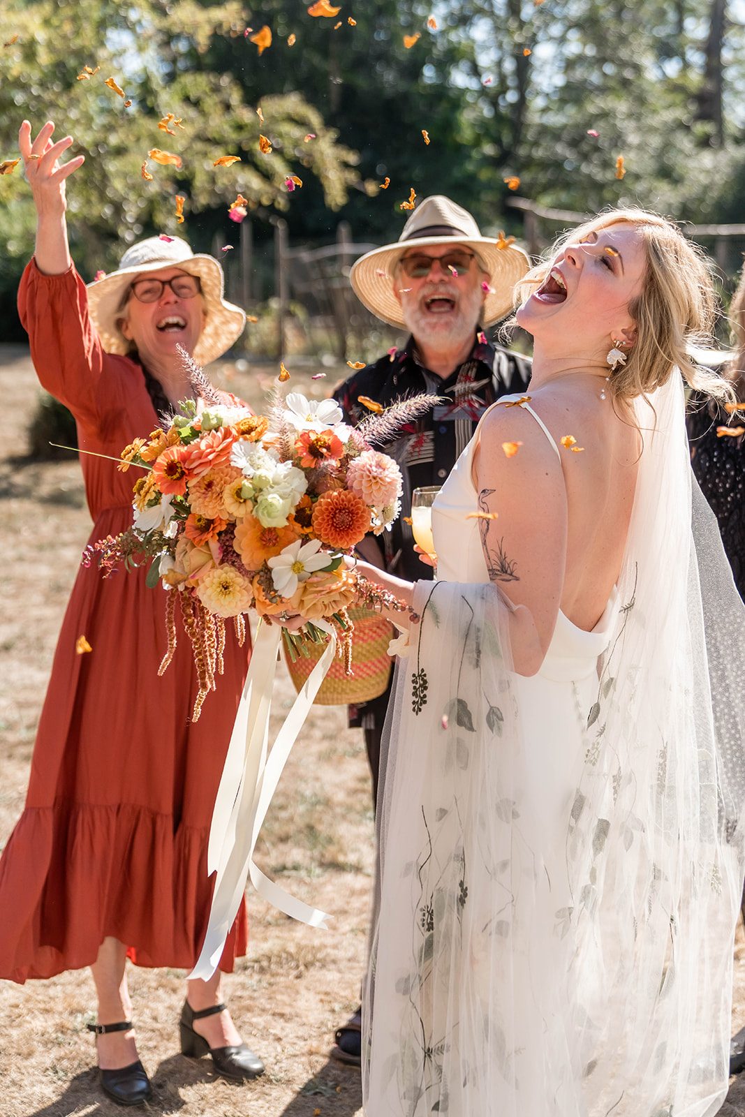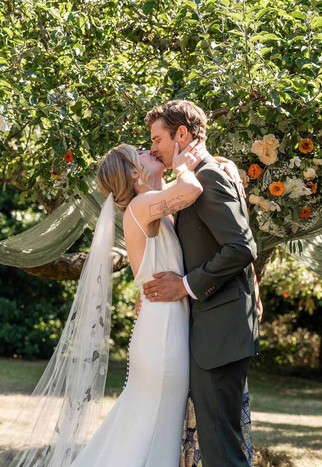 Beneath the golden sun, their outdoor wedding on Hornby Island felt like a dream as they exchanged vows. Sarah was a vision in her simple yet stunning slip dress from Pronovias, adorned with a mesmerizing cathedral veil by Tony Federici, delicately embroidered and flowing with the breeze. Walking down the aisle to the hauntingly beautiful strains of a piper playing traditional Scottish tunes, Sarah’s heritage was honoured in the most romantic way. The ceremony space, adorned with whimsical floral arrangements in soft ivory, gentle yellows, and vibrant oranges by Alina Milek, seemed like a page out of a fairy tale.