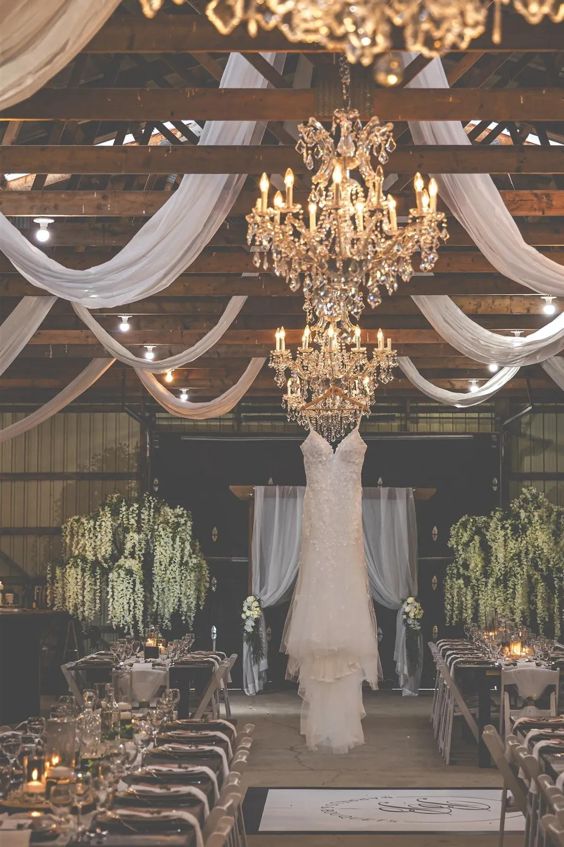 If you’re more of an indoor type (or if the weather decides not to cooperate), the barn’s interior is just as stunning. With its expansive space and flexible layout, it can be transformed into whatever you want. Fairy lights hanging from the beams, two 7.5” wisteria trees, an arbour with white drapery and flowers, and rows of chairs filled with loved ones — it’s the kind of setting that makes hearts swell and eyes tear up.