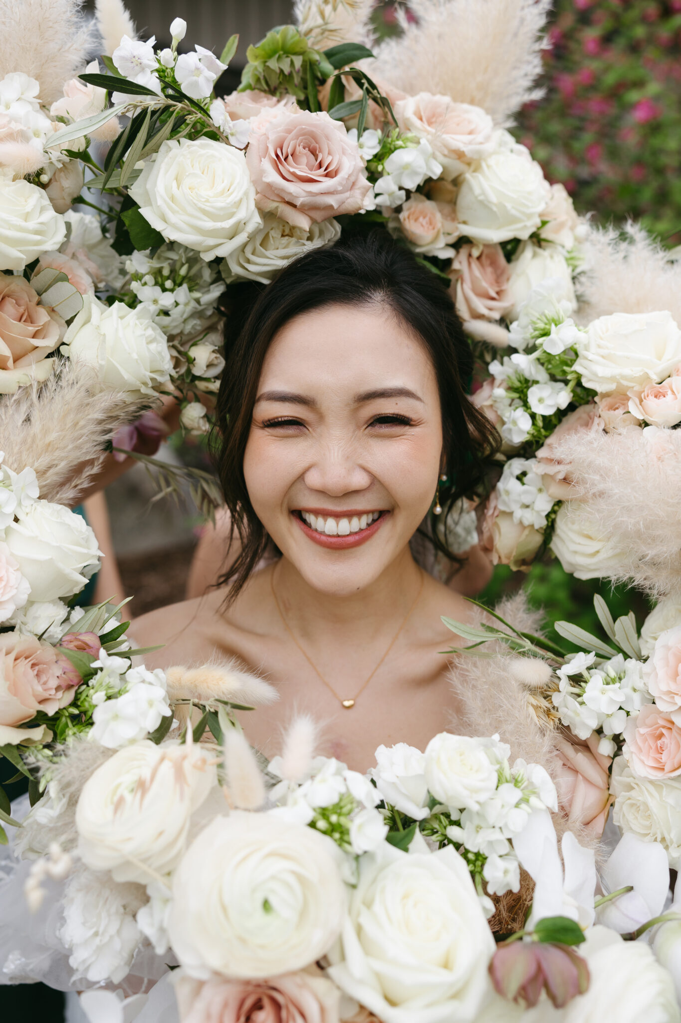 Held at Riverway Clubhouse, the sophisticated wedding featured a white, cream and blush colour palette complemented by dainty blooms like roses, ranunculus and orchids. The two-tier lemon and chocolate toffee cake perfectly matched the floral motif, as did Linette’s gorgeous ceremony dress from the Bridal Gallery. She also wore a traditional Vietnamese Áo dài for a morning tea ceremony, and a modern Chinese dress she changed into in the evening.