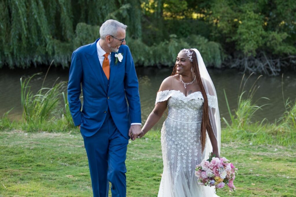 Ryan looked every bit the modern gentleman in a custom three-piece electric blue suit from Suitsupply Miami, accented with a bold orange tie that brought a playful pop of personality to the palette. Together, they struck a perfect balance of classic elegance and joyful colour.