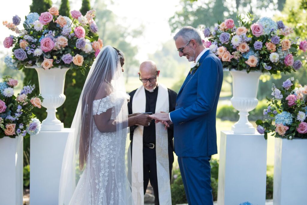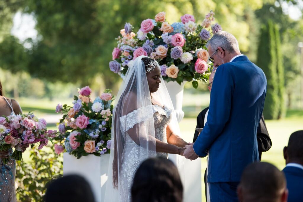 Under the summer sun, the ceremony unfolded outdoors, framed by lush clusters of pink roses, blue hydrangeas, white peonies and purple delphiniums. The pastel blooms lined the aisle and filled towering vases, creating a whimsical garden effect that glowed against the late-afternoon light.
