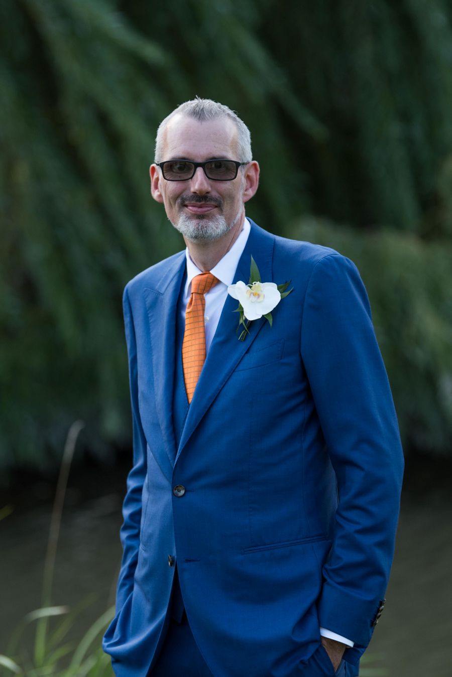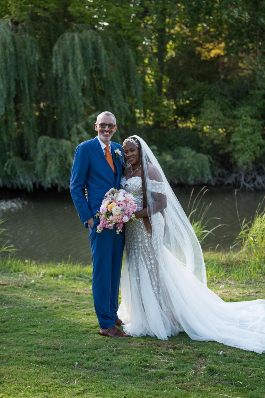 Ryan looked every bit the modern gentleman in a custom three-piece electric blue suit from Suitsupply Miami, accented with a bold orange tie that brought a playful pop of personality to the palette. Together, they struck a perfect balance of classic elegance and joyful colour.