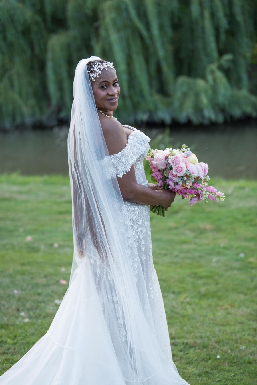 When Lynette walked down the aisle in her breathtaking La Premiere Couture gown – an off-the-shoulder masterpiece adorned with intricate beadwork and lace appliqués – every guest fell silent. Her long veil trailed behind her like soft mist, and her bouquet mirrored the romance of the setting: airy, colourful and overflowing with florals that felt freshly gathered from a fairytale.
