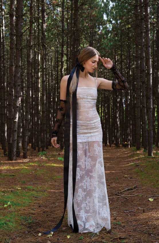 Dress, Maet; lace arm warmers, Yuhan Wang from SSENSE; ring, Dean Davidson; shoes, Aldo; ribbon, stylist’s own.