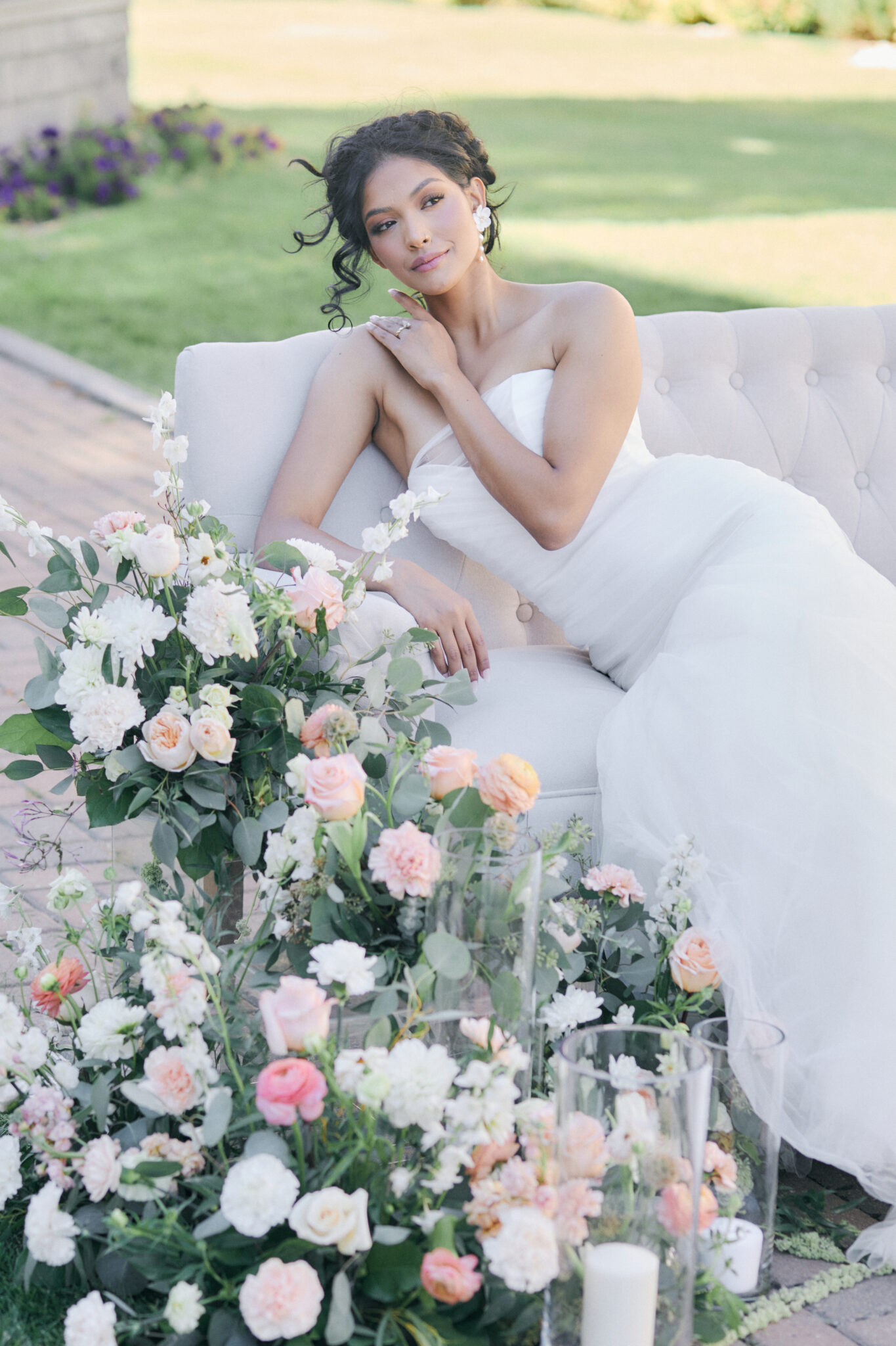 A plush cream loveseat framed by florals acted as the ultimate floral couch moment for beautiful bridal portraits and in a real wedding setting – an incredible conversation area. Tablescapes featured a continuous runner of blooms and twisted taper candles in delicate glass vessels. The vibe was airy, layered,and totally luxe – but never overdone. A1 Rent-Alls The Party Store provided the subtle-yet-stylish decor pieces that tied it all together, balancing texture and softness like pros.