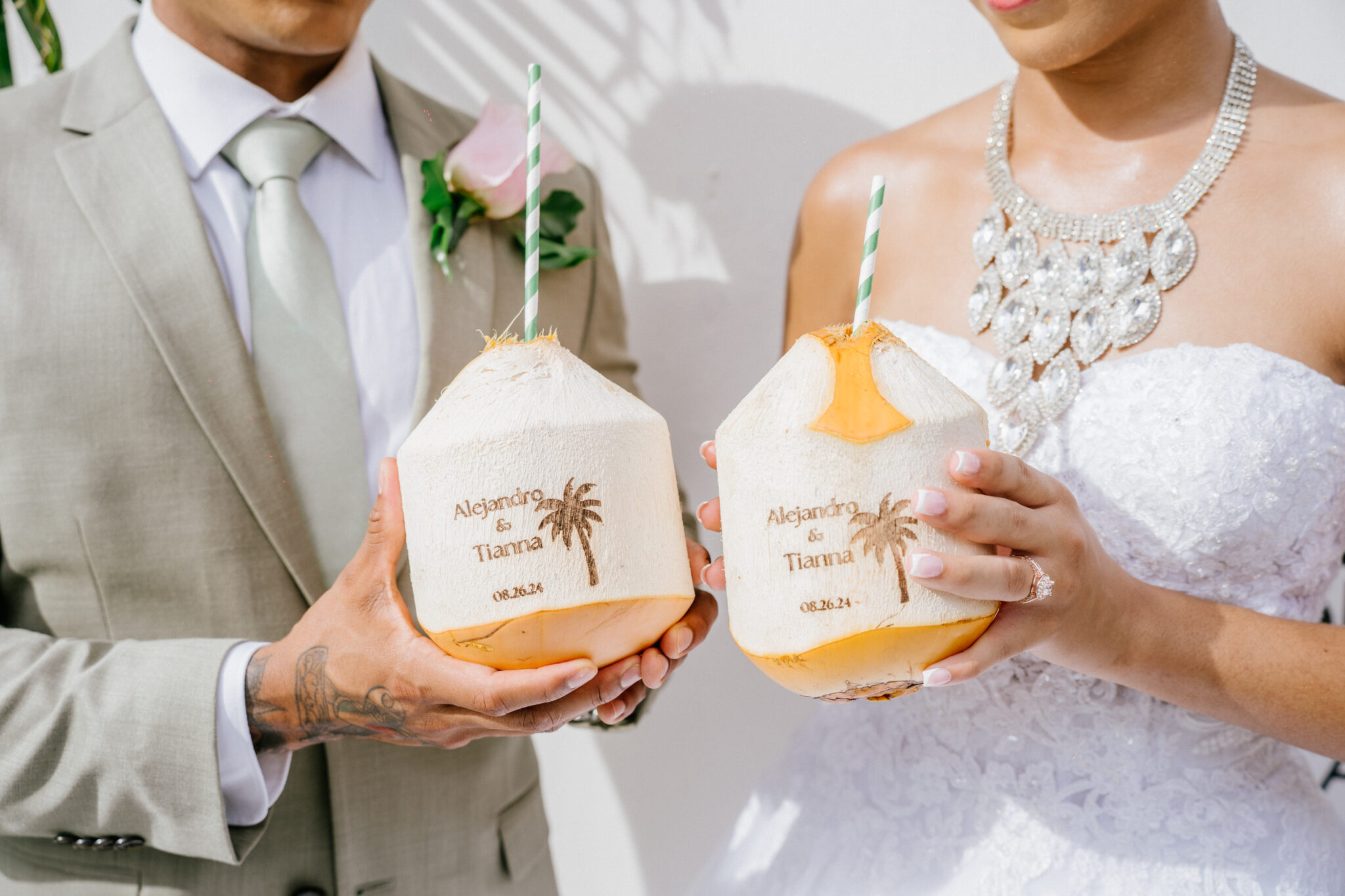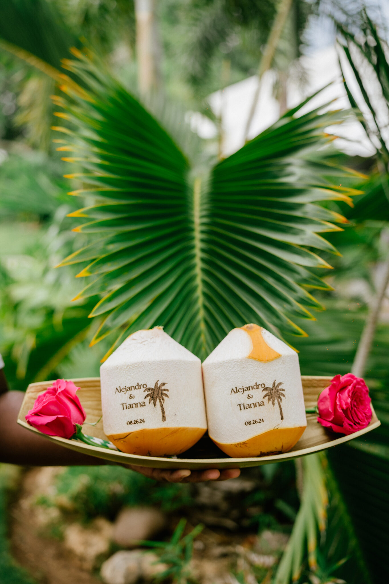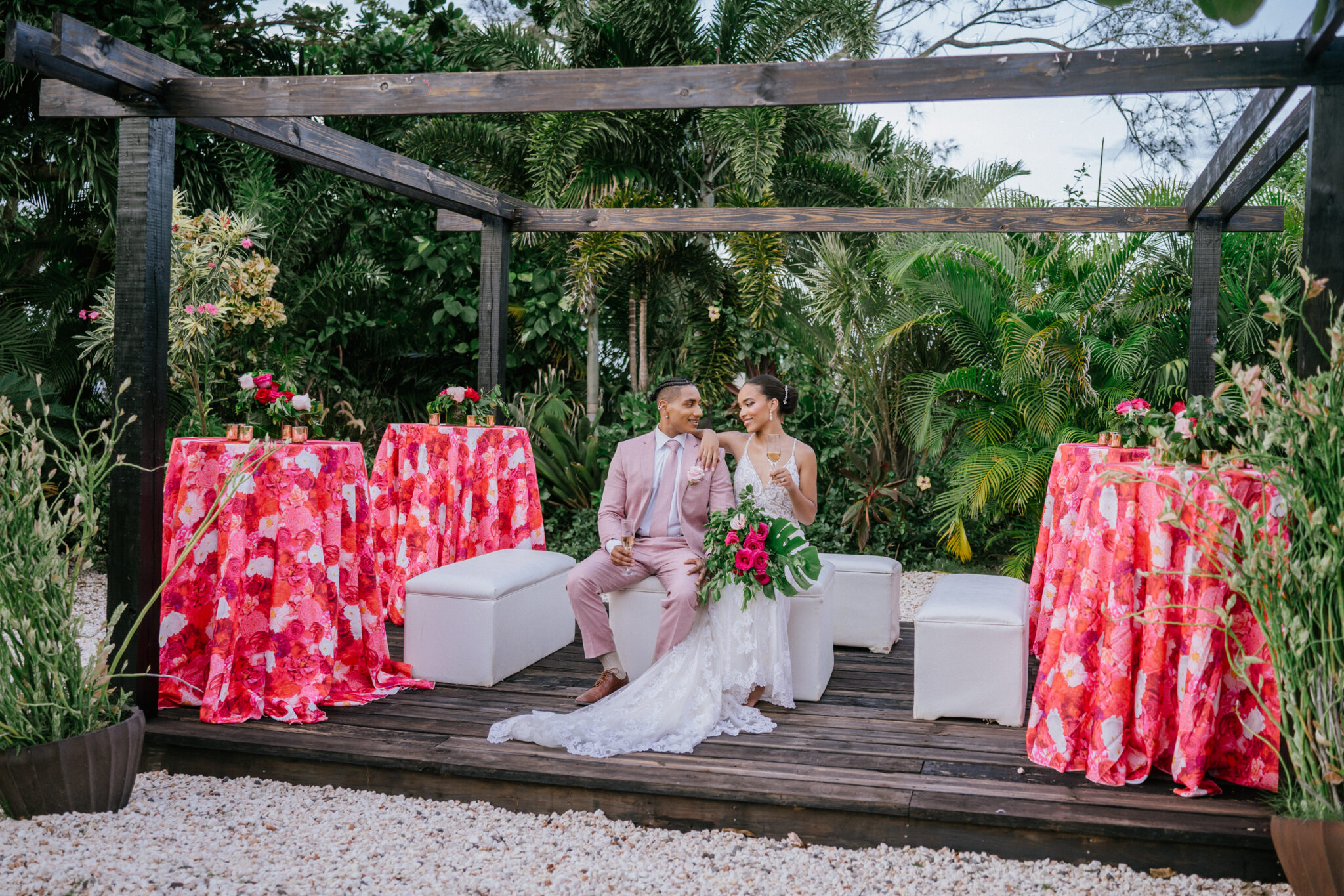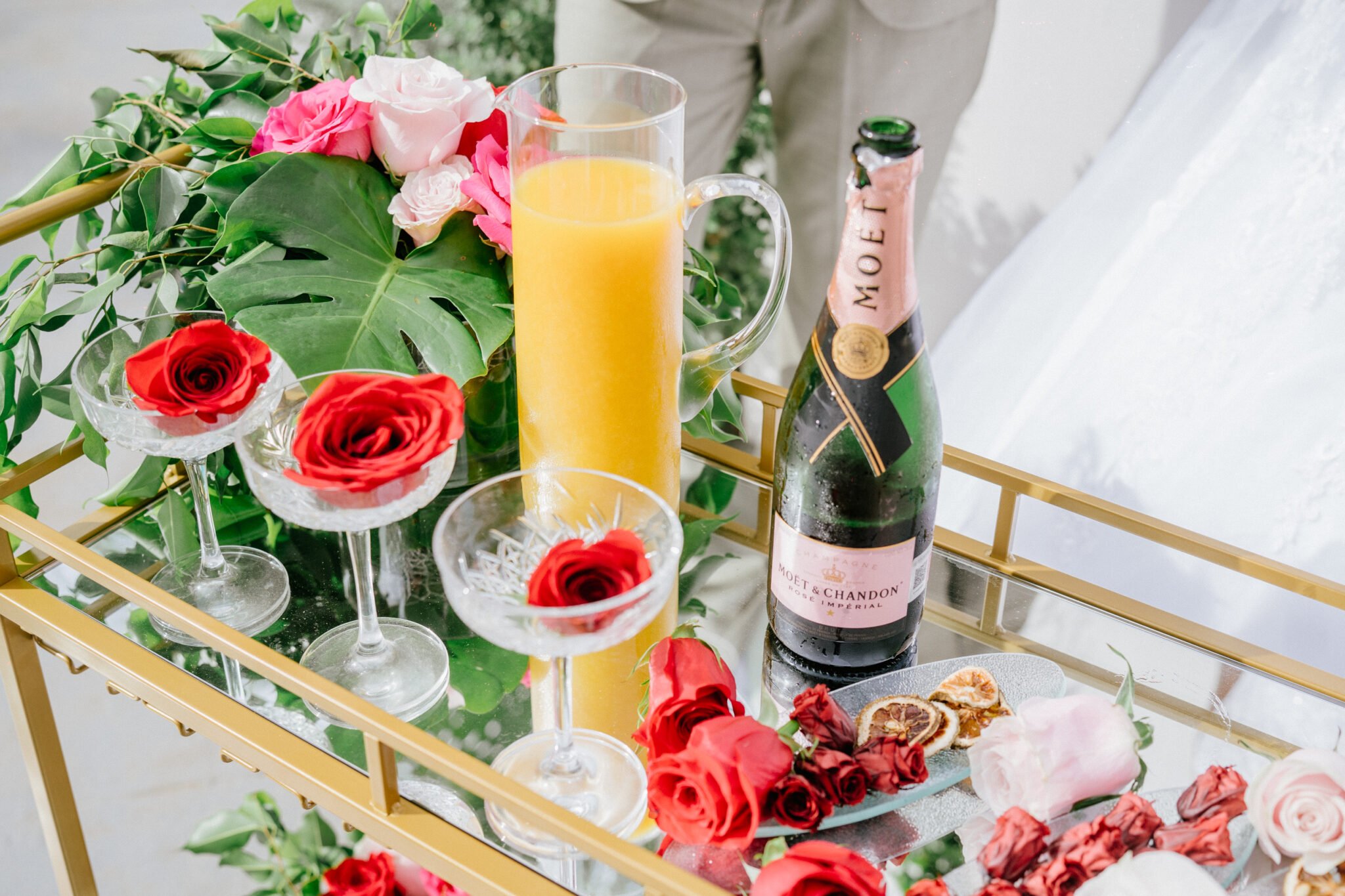 Before the ceremony, they enjoyed a quiet poolside toast at a beautifully styled Mimosa bar, where fresh tropical fruits and chilled champagne awaited them. This intimate pre-ceremony ritual, surrounded by the vibrant flowers floating in the pool, offered the couple a chance to soak in the joy and excitement of the day.