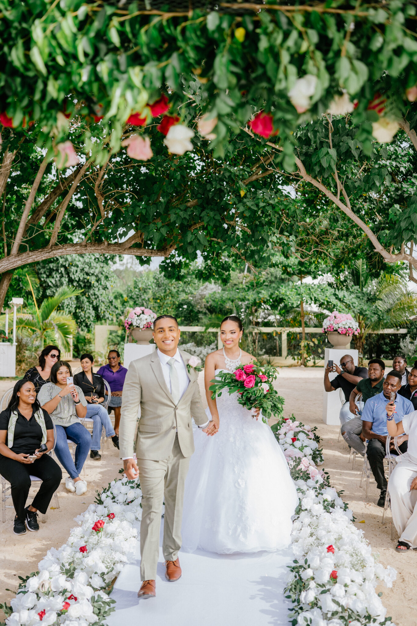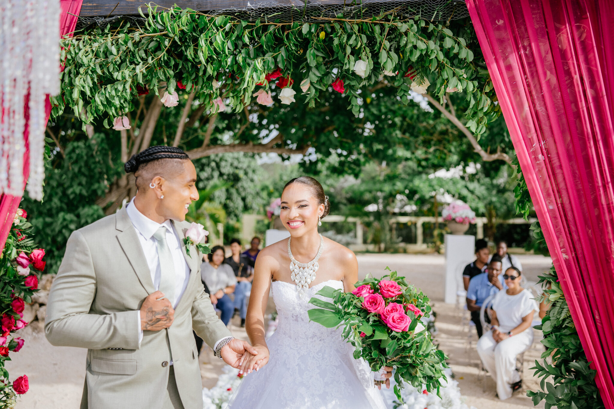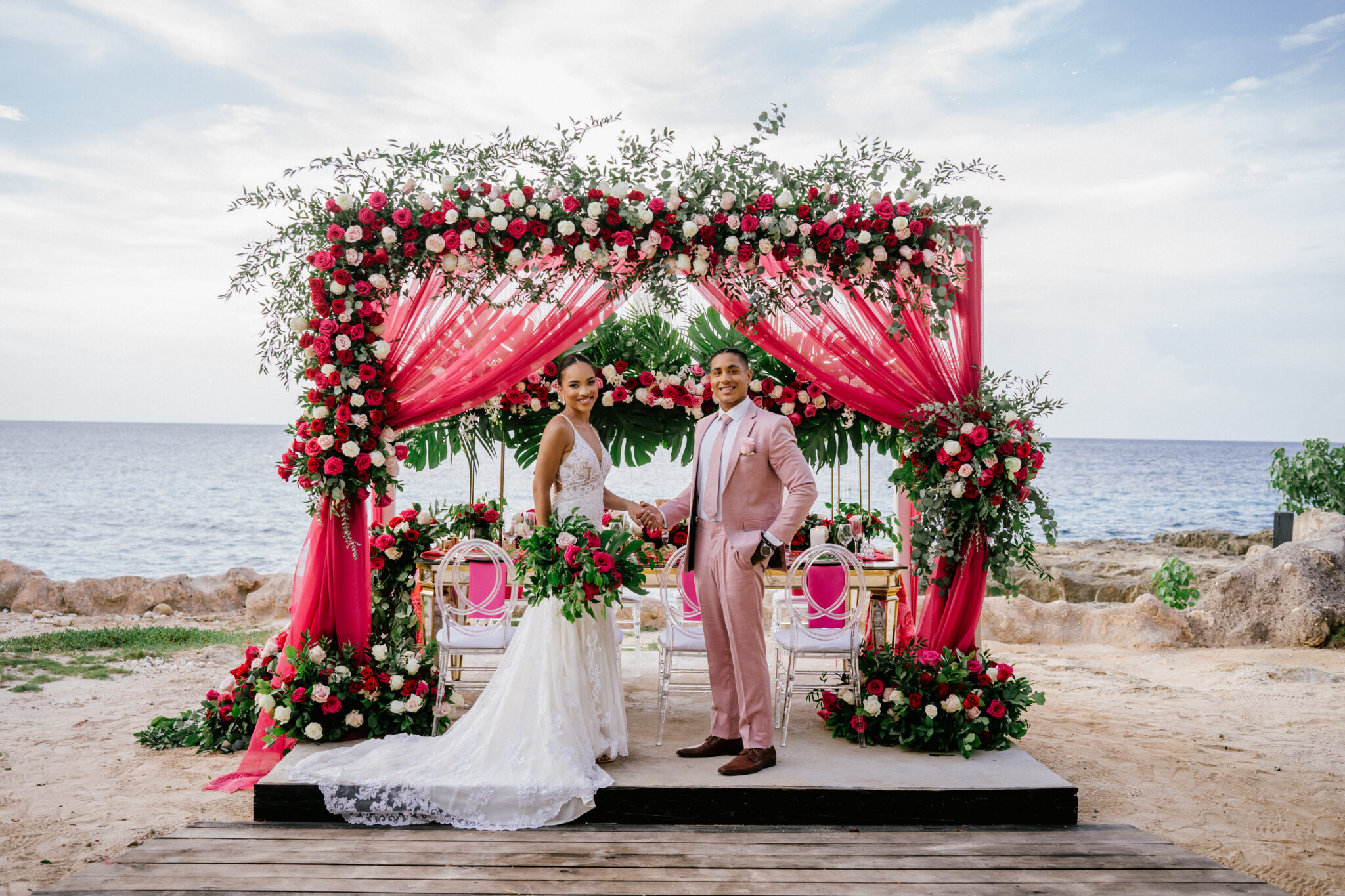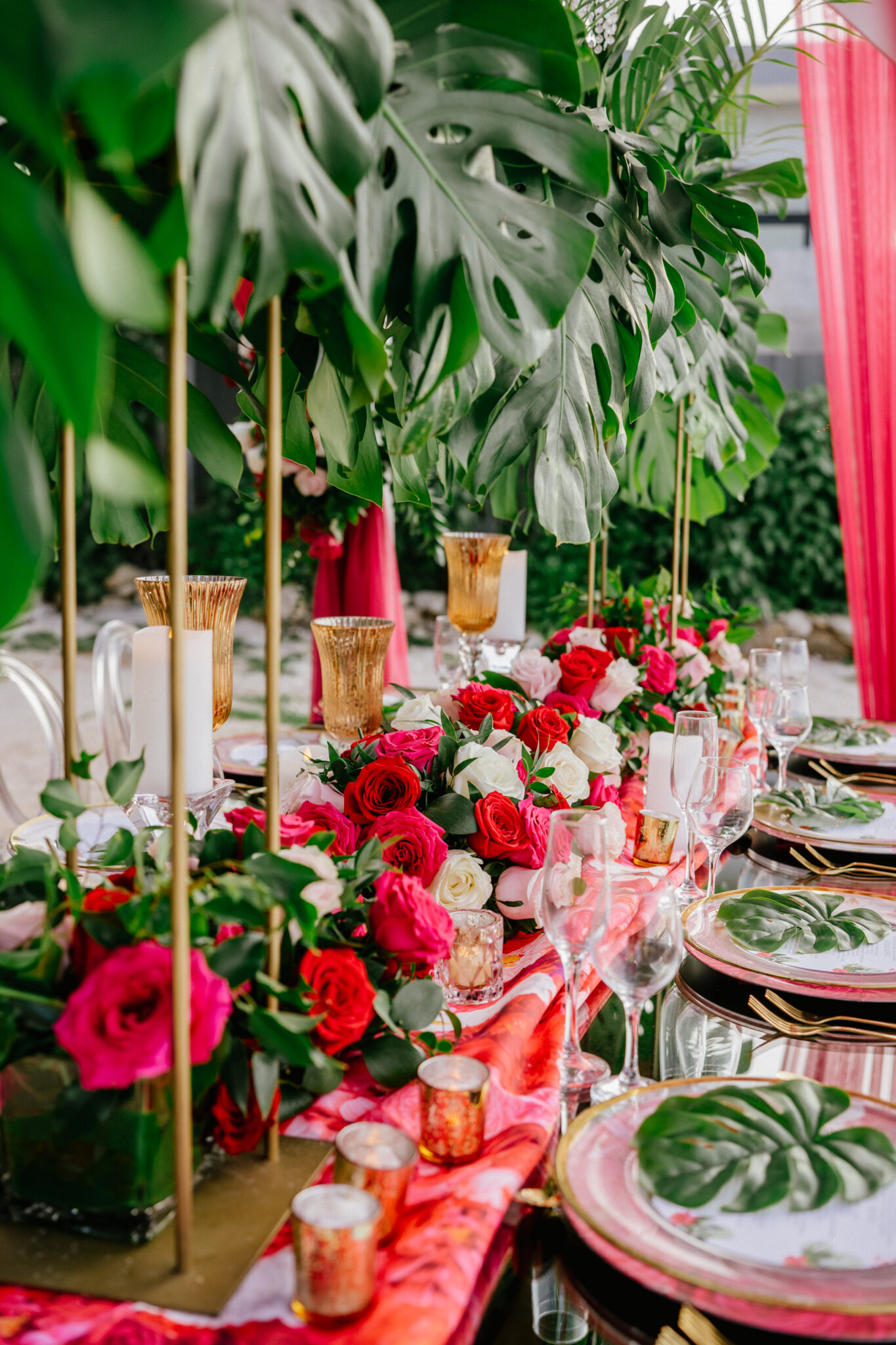 The theme for this destination wedding in Jamaica, Tropical Romance, came to life through an overabundance of fuchsia and red roses intertwined with monstera leaves, setting a lush, exotic atmosphere from ceremony to celebration. The ceremony arch, overflowing with hundreds of vibrant blooms, created a captivating focal point, enhanced by a sparkling chandelier and a delicate crystal curtain backdrop. This transparent curtain provided an elegant frame for the couple without obstructing the view of Borghinvilla’s rugged cliffs and the endless blue sea beyond.