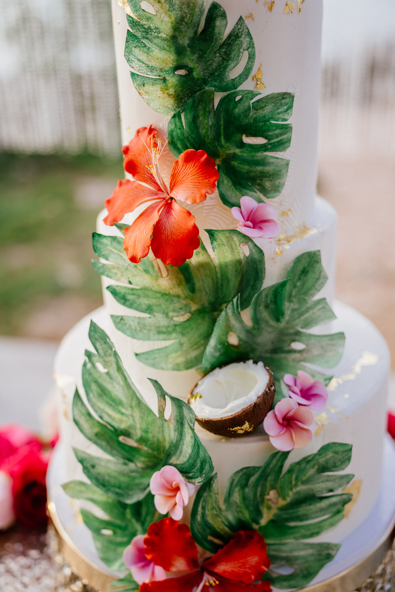 After exchanging vows, the couple transitioned to a chic reception area adorned with sheer fuchsia curtains and another magnificent floral arch. A mirrored table served as the centrepiece, brimming with even more fuchsia and roses, monstera leaves and elegant tableware. Flowers floated across the pool, and the garden swing, wrapped in blooms and greenery, invited guests to enjoy the space from every angle. There were custom-etched coconuts and a tropical cake adorned with coconuts.